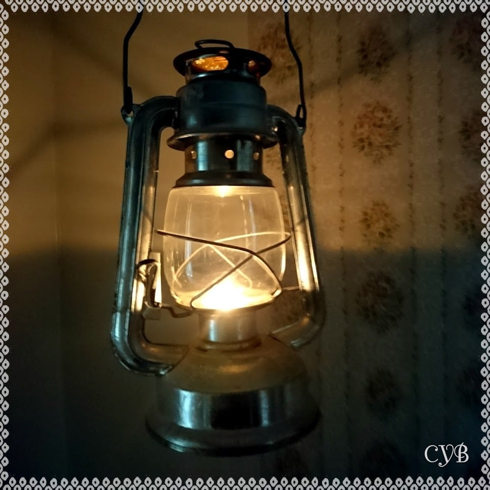 Det blir väldigt mörkt inne i vår nedervåning på huset med 1700-tals, lågt i tak när lamporna släcks, så tänder fotogenlampan och några ljus och ljuslyktor.