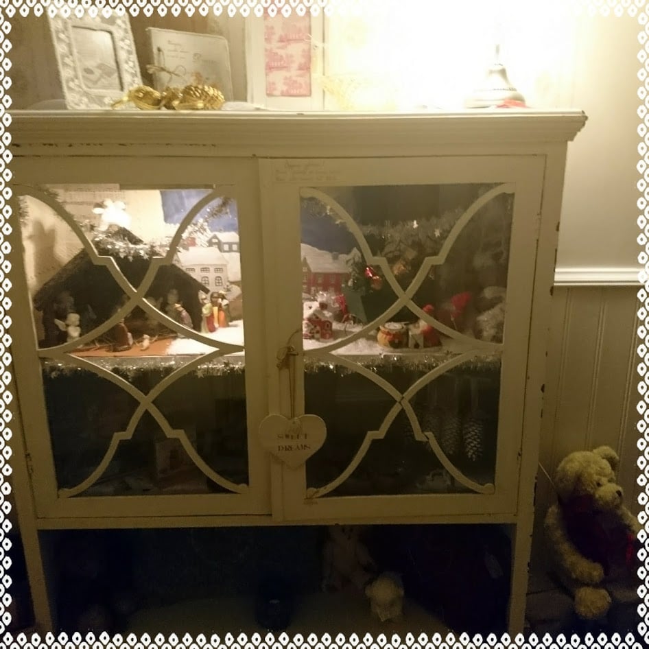 "Här är historien om vår tradition att göra julskåp precis som vi gjorde det när jag var barn i familjens gamla vitrinskåp... Jag minns hur jag kunde sitta i timtal och bara titta och njuta av den lilla julvärlden som lyste där innanför de spröjsade glasrutorna som barn..."